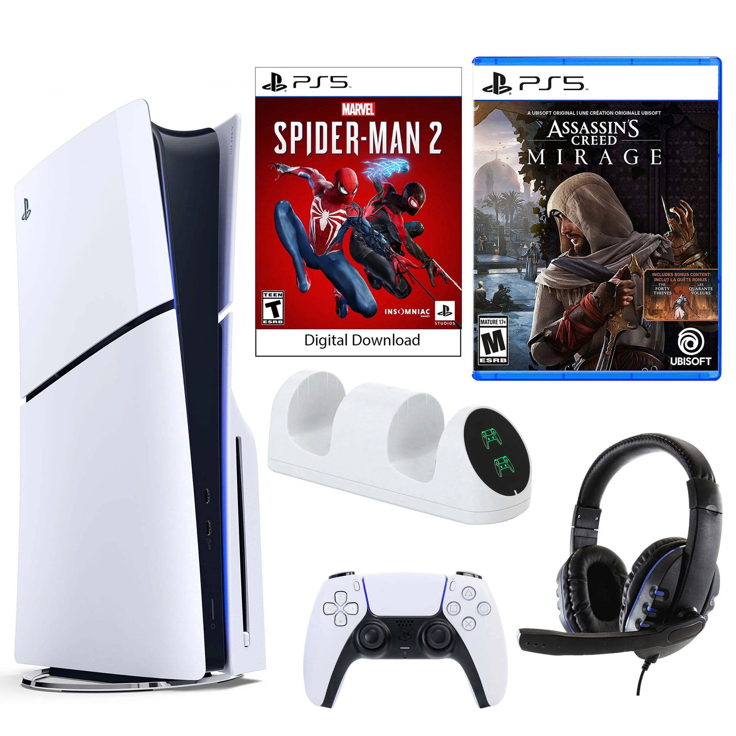 Sony New PS5 Spider Man 2 Slim Console with Mirage, Headset and Dual Charging Dock